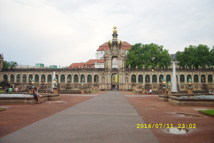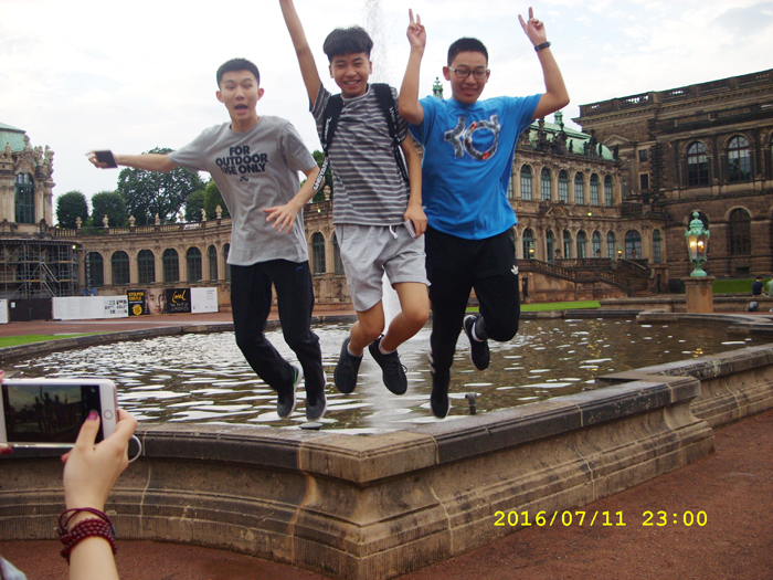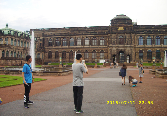 下午孩子们13:00放学,我按时到达了教学点,刘畅老师和Mr. Fredric早已到达,等孩子们与Martin老师告别之后,Mr. Fredric带我们去了一家自助餐馆给我们加餐,改善伙食,里面有米饭、炒菜、烤鸡翅等等,能吃到中国的味道,孩子们吃得不亦乐乎,吃了饱饱的一顿!中午我们稍事休息之后,孩子们自习、预习课程内容,并和Mr. Fredric练习了乒乓球。晚饭后,刘畅老师和Mr. Fredric带我们一行人去市区中心逛街、办理电话卡、并参观古建筑茨温格宫(Zwinger),逛街时孩子们充满好奇心,不时地询问Mr. Fredric许多问题,他给我们逐一讲解回答,并介绍了许多新鲜事物,在整个行程中,我们是徒步的,Mr. Fredric很有耐心地用他那不太标准的普通话给我们反复强调:“左看看,右看看,always watching, then walk across,快点!快点!”每遇到新奇事情,都很耐心地给我们讲解、演示,还不时逗乐孩子们。在我们参观古建筑茨温格宫(Zwinger)时,Mr. Fredric详细耐心的介绍,引起孩子们无数好奇心,同时不免感慨欧洲艺术家们智慧和精湛技术。茨温格宫是德累斯顿最为恢弘和著名的古建筑,宫殿重曲线、重装饰,华丽炫目。中间是占地1万平方米的方场,宫殿建筑围成一圈,宫内处处有精致的石雕,最美的是大喷水周围的出浴仙女塑像,姿态神情各不相同。宫殿西南面是正门,顶似王冠,叫王冠门。茨温格宫因建在茨温格花园上而得名,是德累斯顿的象征。在德国是晚上九点半才天黑,在我们结束参观时,孩子们恋恋不舍,不时回望而离去。