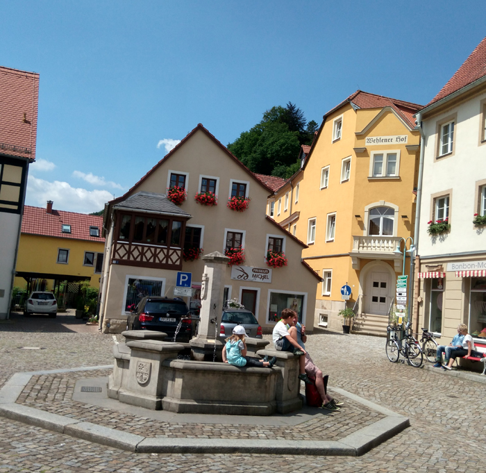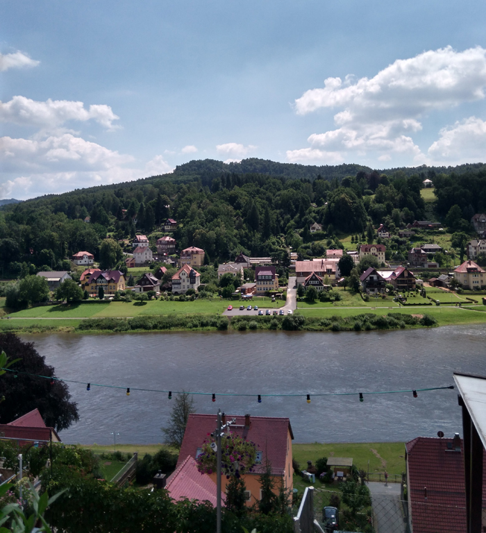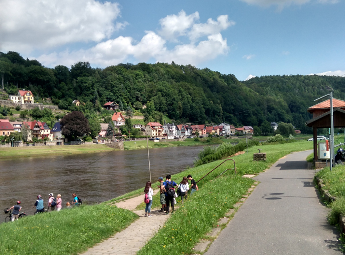 在与Martin老师会面后,我们从德累斯顿火车站乘坐每半个小时一趟的火车Strassenbann,大约45分钟左右就可以到达小站Bad schandau,沿途中我们欣赏了Elbe River(易北河)沿岸的美景,河道蜿蜒,两岸风景秀丽;奇特的平顶山头,千姿百态的石林,巍峨的城堡,茂密青翠的树林,以及红屋顶作为陪衬的小镇,勾勒出一幅大自然鬼斧神工般的盛景,吸引着无数自然爱好者前来一睹尊荣。