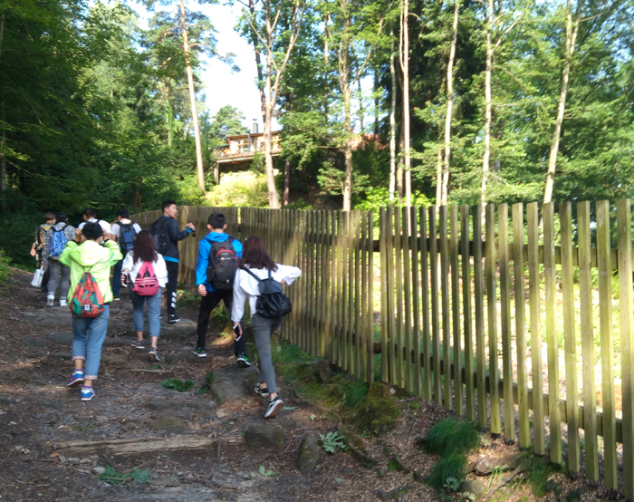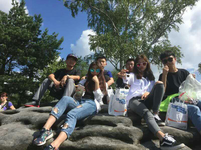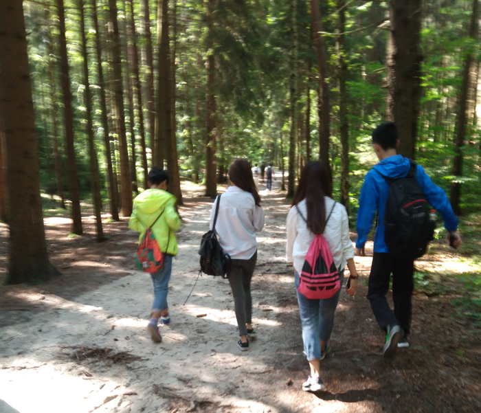 大约9点,我们到达了目的地,整装待发,开始了登山远足观光,我们穿过了茂密的森林,慢慢的,林间愈发静谧,只能听见脚底踩着落叶发出的沙沙的声音。偶尔能碰见几个徒步旅行的游客,他们会热情的向我们打招呼,经历了约5小时之后,最终我们拖着疲惫的身子到达了顶峰,在山顶上我们被迷人的风景吸引住了,此时一扫全身之疲劳,同学们都迫不及待地拿出手机和相机采点着一幅幅美景:怪异的峭壁、巨大的岩石林和幽深的峡谷错落于宽阔静谧的森林之中,幽美如画,放眼望去,满目青翠。