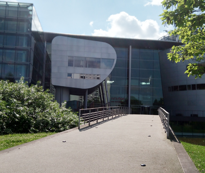 我们乘坐了大概12分钟的车程便到达目的地。只见丛林中座落一栋完全透明的五层建筑大楼,我们穿过桥面,望着水面上还游弋着野鸭子的林间湿地,我们真的无法相信这就是我们即将参观的汽车制造厂,其外观光彩夺目、棱角分明。