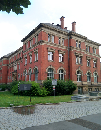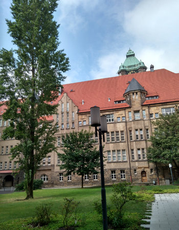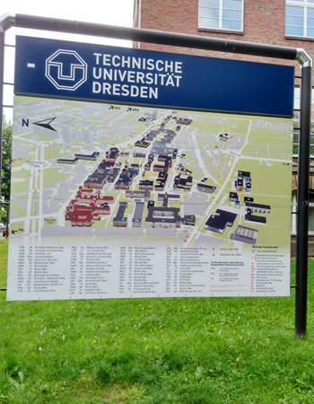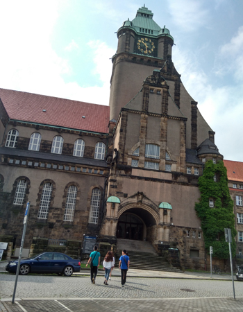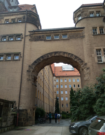 参观的同时,Yanan老师介绍了德累斯顿工业大学的学生会组织和大学宿舍的类型。德累斯顿工业大学学生会除了负责组织学生社团活动之外,还负责德累斯顿工业大学学生餐饮、住宿、甚至提供法律援助,解决纠纷。我们漫步在德累斯顿工业大学主教学区内,Yanan老师给我们解释了德累斯顿工业大学主校区布局图,让我们目睹了现任校长的尊容,以及诺贝尔奖获得者来此大学作报告的醒目海报。在我们走到Schuman Bau舒曼楼时,Yanan老师介绍了这栋教学楼的来历,这栋古建筑最早是一座监狱,后来改造成教学楼,里面的教室分布带有一定的迷宫性,对于才来的新生来说,不容易找到自己的教室,这引起同学们的好奇,想看个究竟,遗憾的是周末教学楼锁闭。