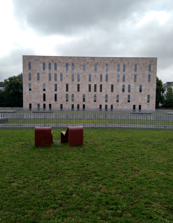 我们最后参观的是德累斯顿工业大学图书馆。此图书馆以朴实和人性化而著称,是一栋灰色的毫不起眼的建筑,其外观没有任何文字标识,远看就如同简单装修的毛坯房。