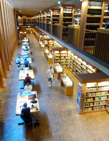 此图书馆采光效果好,装饰色调柔和高雅,设计非常人性化,这随处可见。比如阅读区,尽可能引入自然采光,自然光能透到地面下负三层;考虑到个人阅读习惯的不同,设计了不同的阅读空间,有:独立阅读区(许多独立小间)、站立阅读区(有人爱站着看书)、可躺阅读区((有沙发)、坐着阅读区(一人一桌)、可聊阅读区(稍大房间)、公共阅读区(大厅,营造浓厚的阅读氛围)和专家阅读区(封闭,里面全是珍贵孤本)。