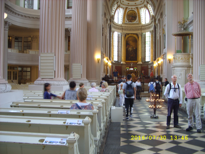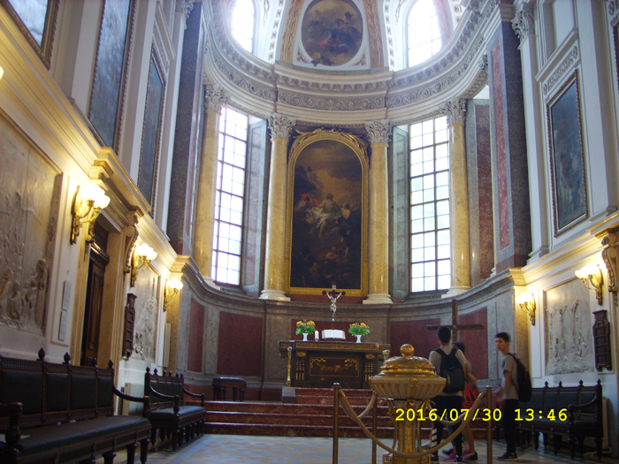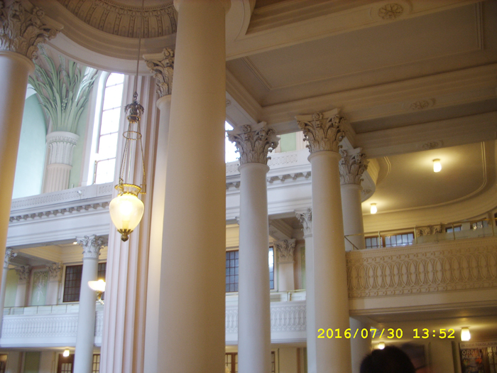 我们莱比锡之旅的第一站是圣尼古拉教堂(Nikolaikirche)。这座罗马哥特式教堂位于老城区中心的尼古拉大街旁。尽管外表平凡朴实,内部装饰却极为华美脱俗,是新古典主义风格。教堂内长排的座椅洁净如洗,独一无二的绿色棕榈立柱头和淡淡粉红色的立柱相得益彰,颜色特别柔和。椰树状巨柱的设计给人印象深刻,天花板上华丽的装饰以及和平天使图案非常显著,雪花石膏制浮雕和罗马式木质十字架也是非常特别的艺术品。该教堂里的管风琴被认为是欧洲最好的浪漫风格管风琴之一,它是由102根风琴管组成的。巴赫在1723年到1750年作为唱诗班的风琴弹奏者和指挥活跃在这里,它的著名作品在第一时间在这里演奏,成为这个教堂历史上一个闪亮点。Yanan老师给我们讲述了圣尼古拉教堂的一段历史:早在1989年10月9日星期一下午5点,聚集在圣尼古拉教堂的人们和平祈祷结束后,每人手持象征和平的烛火鱼贯走出教堂,莱比锡的市民也自动自发加入,很快和平祈祷演变为了抗议东德政府统治的游行,人们高喊Wir sind das Volk(我们是人民)等口号,示威最后以和平收场,结束了两德国40年的对抗,从此在德国形成了每周一下午市民游行的习俗。而这座教堂拉开了东西德合并的序幕,可以说这座教堂改变了德国的历史。