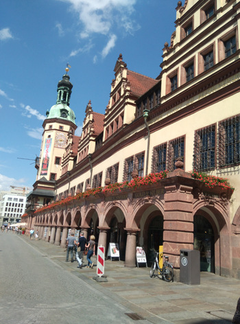 结束参观圣尼古拉教堂后,我们前往莱比锡大学(Universität Leipzig)。路过老城广场中心的莱比锡老市政厅,它是德国最著名的建筑物之一,共有三层,最下面是棕红色石料砌筑的拱廊,中间为简洁的黄色墙身,最上面是红瓦斜坡屋顶。屋顶上还建有六座造型优美的高阁楼,阁楼中间高耸的钟塔是广场的中心标志,与众不同的是,这个尖顶钟塔并不在建筑中间,而是正好位于该建筑的黄金分割点即6.18处。这栋大楼以其优美的外观而成为德国最漂亮的文艺复兴建筑之一。其前面的广场常举行文化艺术活动,我们路过的这个下午,就有一个大的乐团在为市民义务演出,引来许多观众赏乐聆听,观众不时给予阵阵掌声,甚至我看到一个八十多岁的德国老奶奶伴随着乐律跳动起来。Yanan老师说,莱比锡是著名的音乐之城,莱比锡的居民十分酷爱音乐,很多人都会拉小提琴等乐器,这里是德国音乐会的发源地。