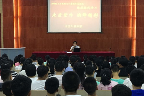 8月24日晚7点,初中部在阶梯教室召开了2016级七年级新生入学校纪校规学习。与会人员有张小平校助和七年级班主任和所有新生,会议由赵润云老师主持。会议伊始,张小平校助对2016级七年级新生的到来表示热烈的欢迎。会上,张校助给同学们提出了三点要求:要在品德纪律上严格要求自己,尽快实现从小学到初中的转变;在学科知识掌握上,要实现学科科目的跨度学习和积累,增强自学能力;要做一个有理想的中学生,志存高远、有所作为。他对同学们更是寄予厚望,“每天都要努力超越自己,最终成为优秀的世外学子。”