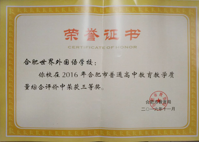 热烈祝贺我校荣获2016年合肥市普通高中教育质量综合评价三等奖
