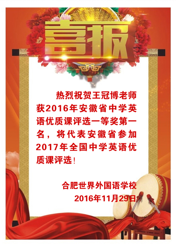 王冠博老师获安徽省中学英语优质课比赛第一名