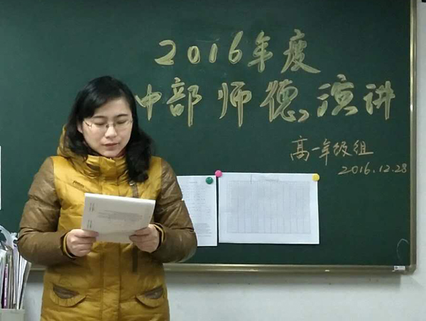本次演讲比赛以“立高尚师德,树教育新风,做一名有爱心、责任心的好老师”为主题,旨在宣传广大教师在教书育人、管理育人、服务育人的感人事迹;讲述教师与学生之间相互尊重、相互学习、相互关爱的真情实感。高一年级的段平文、黄珊老师、高二年级的谢芳、毛颍老师、高三年级的乔丽娜老师共5位参赛教师都联系自己教育教学的亲身经历和感受,畅谈了对教育事业的忠诚,讲述了对学生的热爱、关心和帮助;他们以饱满的热情,多角度阐述了对师德师风的理解。她们富有激情、声情并茂的演讲获得诸位教师的阵阵掌声。