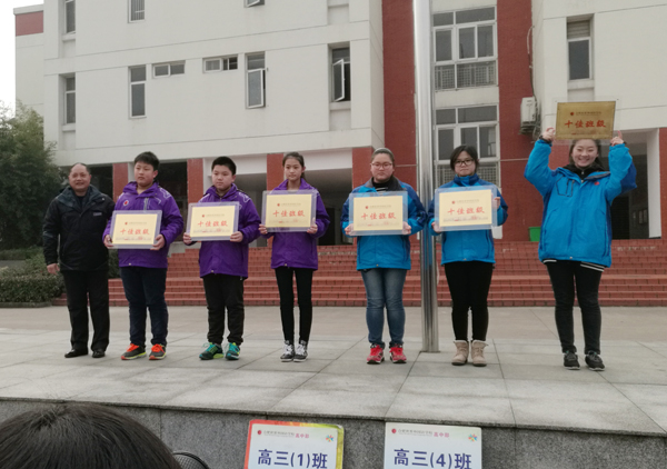 升旗仪式的最后是党支部副书记叶旭光宣读上一大周“十佳班级”名单,由校长、党支部书记邵忠德为获奖班级颁奖。