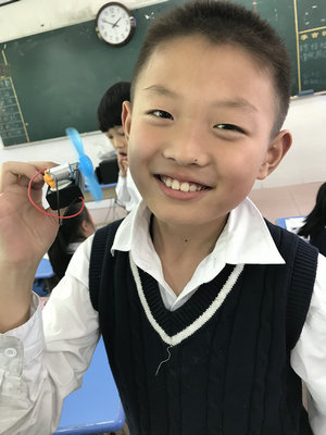 学生张璐阳说:“我拿到了心爱的风扇,那是我仰慕已久的科学实验题材,当我制作成功,清风吹来时,我激动万分,我也举着我的风扇和他一起旋转。 可是我却有不少疑惑。小马达是我最好奇的,他是怎样把电转化成旋转的呢?为什么有的同学的风扇风向从背后吹来呢?我要努力学习,探索更多的科学!”