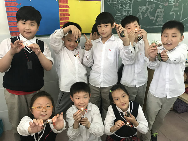 学生何振韬说:“打开制作袋子的那一刻,我一脸茫然,有小灯泡、灯座、电池盒,导线、夹子。糊里糊涂的我只好专心听老师的讲解,原来灯座连上灯泡,把电池盒两端脸上导线,再费尽心思将电夹子连接导线另一头。神奇的一幕发生了!哇!我的灯泡亮了!我高兴极了,最后我拍了一张照,让亮光照耀我的眼睛,它可真神奇!”