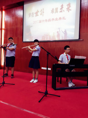 在这六年中,如慈母般的老师给予了同学们无微不至的关怀,老师们的谆谆教诲和春风化雨般的教育,使得孩子们健康成长。为表达对老师的敬意,六(艺)班的同学们以钢琴与长笛合奏的形式演奏了舒缓优美的《茉莉花》。六(5)班的同学们满怀无限的遐想与憧憬献唱歌曲《明天,你好!》。由六年级老师和同学带来的《诗朗诵》情感真挚,将师生之间如海的深情化作一串串字符倾吐而出,让人几欲落泪……随后,毕业班学生代表上台为敬爱的校领导和任课老师献上美丽娇艳的鲜花,学生们全体起立,真诚地向他们道一声:老师,辛苦了!六年的师生情谊寄予心中,同学们之间互相搀扶,互相鼓励,这何尝不是一种缘分呢?当毕业歌《爱因为在心中》回荡在礼堂,祝愿我们的情谊地久天长!