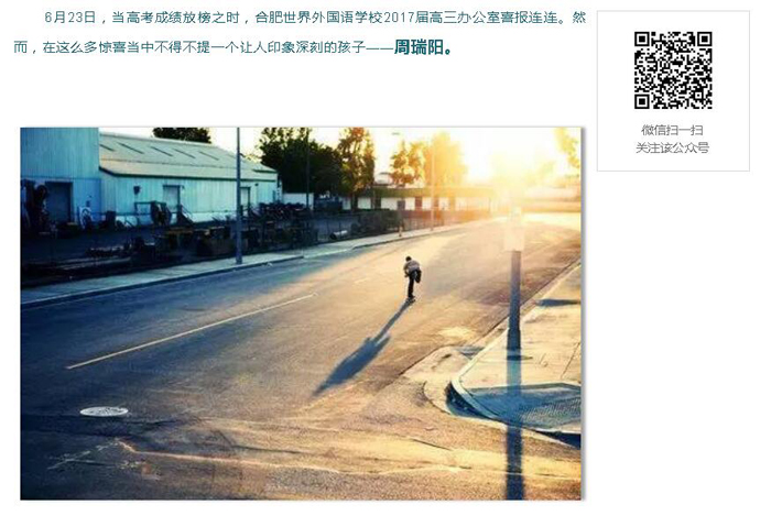 6月23日,当高考成绩放榜之时,合肥世界外国语学校2017届高三办公室喜报连连。然而,在这么多惊喜当中不得不提一个让人印象深刻的孩子——周瑞阳。三年前,中考拿下的694分让刚进入高中的周瑞阳放松了下来,没有初三学业的沉重负担,他的学习成绩一落千丈。