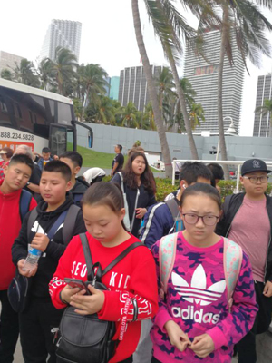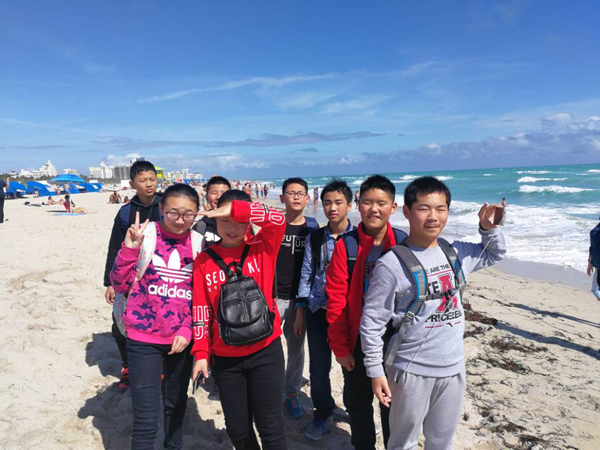 当地时间2月7日,早上我们在入住酒店用过早餐。10点左右,我们中锐教育集团下属三所学校一行近50人乘坐旅游大巴先简单游览一下迈阿密市。然后,来到迈阿密南端的South Beach。它是当地最著名的海滩,也是迈阿密休闲娱乐圣地。同学们纷纷脱掉鞋袜跳入湛蓝的海水中嬉戏打闹。中午,在一个叫中南海的自助中餐馆用完丰盛的午餐之后。我们来到了当地一个最大的购物中心Sawgrass Mills Outlet。这里有超过350家品牌的奥特莱斯和工厂店,商品涵盖时装、珠宝、美容、玩具、运动等等用品。孩子们从下午一点半一直购物到晚上六点。有买纪念品的,有为母亲买Burberry包的,有买耐克运动鞋的,有为家长购买LANCOME化妆品的……一直到夜色阑珊时,我们才意犹未尽的离开。在回程的大巴上,由于时差和购物的疲惫,同学们全部进入梦乡。等到达晚上就餐的川菜特色的中餐馆,很多同学都很难叫醒。吃完饭,回到驻地,同学们都纷纷表示今天真是辛苦,幸福又难忘。