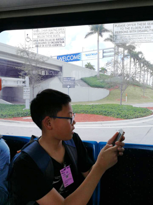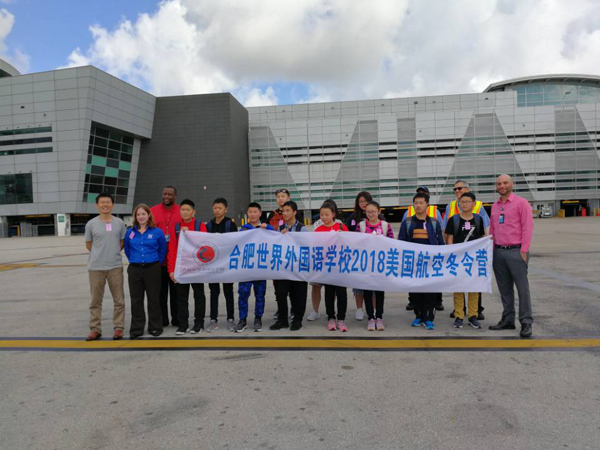 九点半左右,我们进入机场,机场举行了一个简短的欢迎仪式。此次活动的机场负责人发表了简短的欢迎词。随后我们分成两辆机场观光大巴,在工作人员的带领下开始参观机场。在我们进入机场之前,机场在大型户外广告屏上打出了欢迎我们的欢迎词。一路上解说员给同学们讲解了很多迈阿密机场相关知识。例如迈阿密国际机场是美国仅有八个提供大型喷气式飞机客车A380定期航班的机场之一。