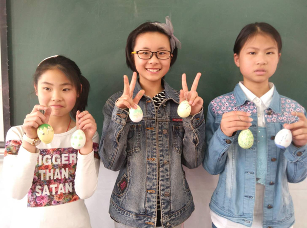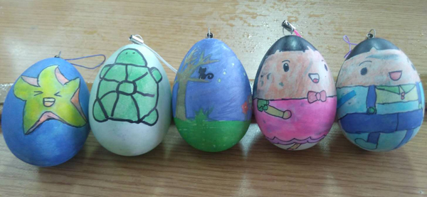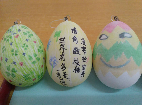 4月1日星期日,恰逢复活节,五年级各班利用活动课组织学生们一起绘制彩蛋。大家分小组合作,一起设计彩蛋图案,一起绘制涂色。有的孩子为了效果美观,先在纸上画了草稿,再进行修改,直到自己满意为止,再在蛋上绘画。两节课过去了,一个个精美的彩蛋绘制成功,孩子们把它们穿成串,挂在教室里,装饰教室。这些彩蛋漂亮有创意,它们代表了孩子们的美好心愿与幸福快乐,见证孩子们的成长。