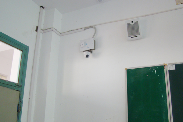 镜头三:为保障英语考试听力顺利播放,每间教室都备有两套播音系统,广播室备用应急电源。