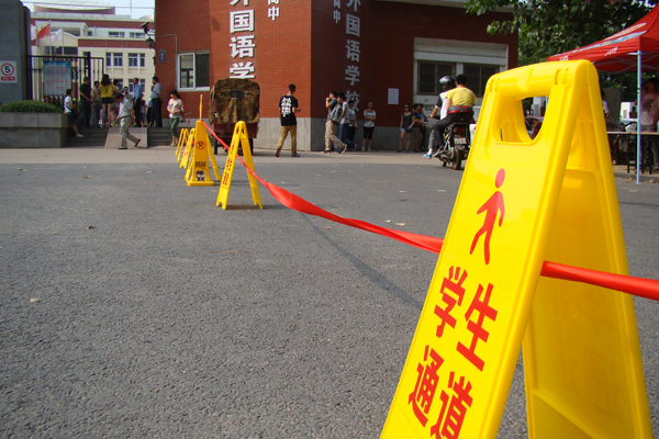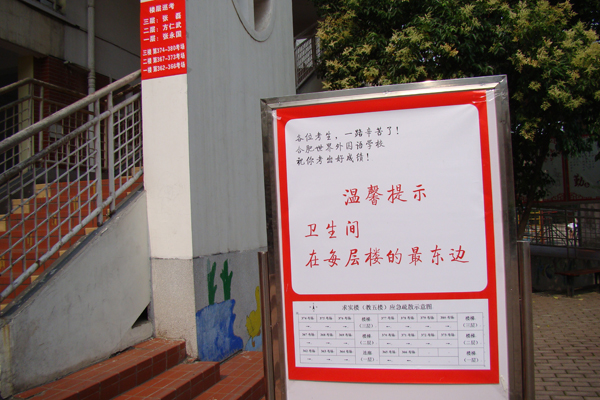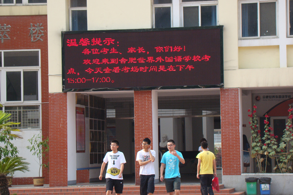 镜头四:校大门口电子屏显示“2014年普通高等学校招生全国统一考试合肥考区合肥世界外国语学校考点”,大门口设置“学生通道”,正对大门处放置了考场平面示意图和考生须知,考区内各种标示清晰。