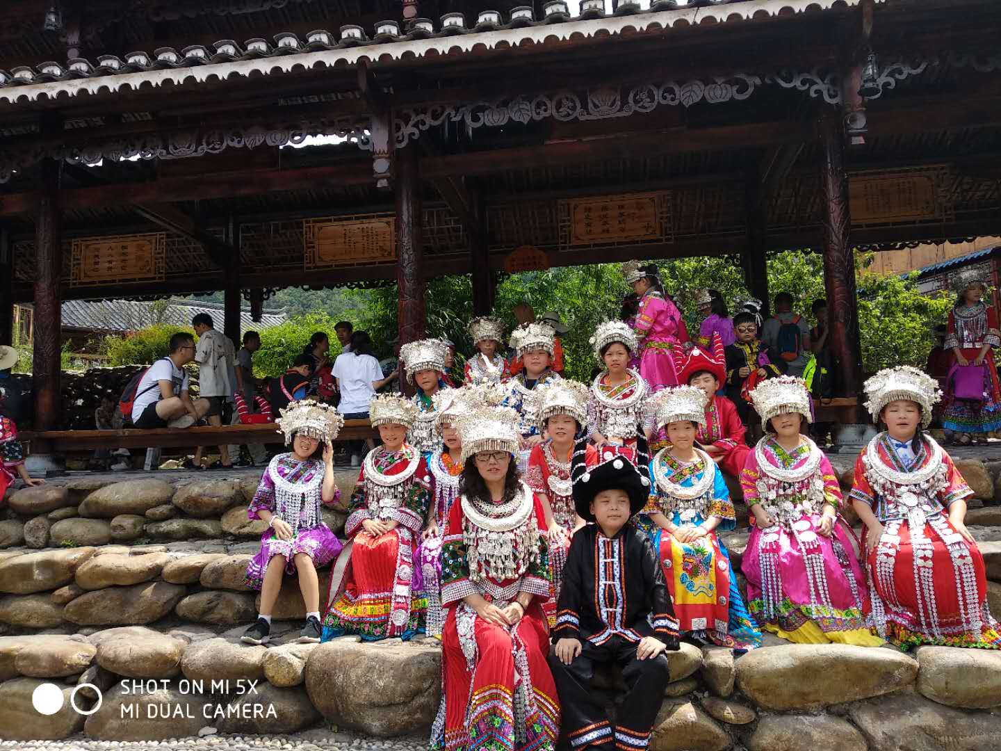 中午,我们一起享用了苗家的传统餐——长桌饭。同学们新奇而又兴奋,说说笑笑,欢声笑语回荡在苗家这片美丽的土地上。 饭后,在旅游车的带领下,我们登上此地最高峰,站在峰顶,苗寨村落尽收眼底,远处青山环绕,村寨居于青山之中,错落有致,别具特色。峰顶游客如织,虽天气偏热,可阻挡不了游客们对苗寨的喜爱,不论男女老少穿上自己心仪的苗家服饰,摆出各种pose,留下美好的一瞬。当然我们也不能落后,来了就要做一回苗家人。看着五颜六色的苗家服饰,学生们激动不已,看看这件喜欢看看那件漂亮,挑来拣去选中合适的穿在身上,瞬间一个个变成了小阿哥小阿妹,在苗家服饰的衬托下,孩子们显现出了从没有过的美。在镜头下我们把美丽的瞬间永远定格在画面中,成为我们一段美好的回忆。