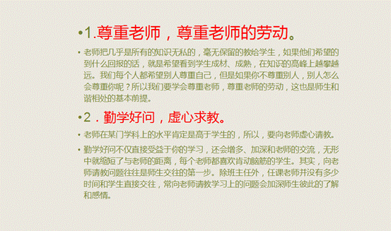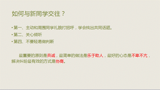 然后,陶老师通过游戏的方式向学生提问“你觉得高中生活怎么样”。整个会场气氛严肃而活泼。同学们积极主动地回答了陶老师的问题,对学校教学环境和学校老师比较满意,大部分同学相处也比较愉快,也有个别同学反映学习不太适应,同学不熟悉,有点孤单。还有同学反映学校热水设施不够完善、寝室人数稍多、学校食堂伙食价钱稍高等。针对其中的环境适应、人际适应和学习适应,陶老师一一给予了指导。针对环境方面,陶老师告诉大家要改变心态,积极主动地适应环境。在人际交往方面,陶老师讲到如何与同学和老师相处。同学之间最重要的原则是真诚,最简单的做法是乐于助人,最好的心态是不卑不亢,解决纠纷最有效的方式是协商。与老师相处,首先应尊重老师,尊重老师的劳动。其次勤学好问,虚心求教。.最后正确对待老师的过失,委婉地向老师提意见。