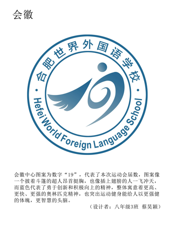 设计理念:会徽中心图案为数字“19”,代表了本次运动会届数,图案像一个披着斗篷的超人昂首挺胸,也像插上翅膀的人一飞冲天,而蓝色代表了勇于创新和积极向上的精神,整体寓意着更高、更快、更强的奥林匹克精神,也突出运动健身能给人以更强健的体魄,更智慧的头脑。(设计者:八年级3班 蔡昊颖)