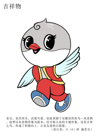 设计理念:喜宝,喜庆欢乐,活泼可爱。创意来源于安徽省的省鸟—灰喜鹊。造型以灰喜鹊形象为蓝本,结合拟人化的卡通形象。这是吉祥之鸟,传递了积极向上,正直友爱的正能量。(设计者:六(6)班 施若尘)