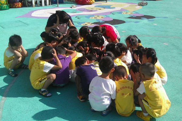 上午9点18分,当学校里的警报铃声响起,幼儿园所有工作人员也迅速到达了各自负责的通道和需要支援的岗位,各班的老师也在同一时间带领孩子们有序地撤离教学楼,安全到达操场中央。每个班级的幼儿都双手抱头蹲在老师的身边。在全园教职员工的通力配合下,全园6个班、200多名师生在1分钟内就全部撤离出教学楼并到达操场中央的“安全地带”。