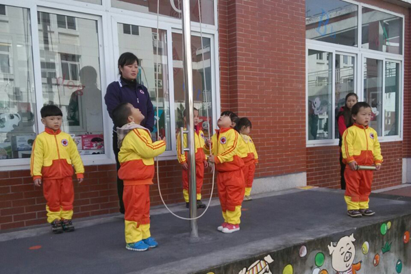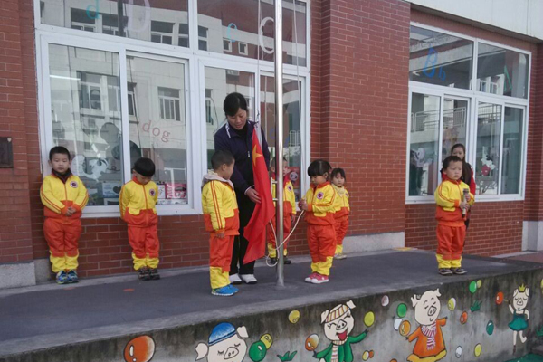 上午10:00,各班级随着入场音乐排着队,有序的进入了场地,等待升旗仪式的开始。小主持人在主席台上宣布升旗仪式开始,四位护旗手用他们负有使命感的小手把五星红旗护在手中,然后踏步走向升旗台。当主持人宣布升国旗,奏国歌,升旗手小心翼翼的拉着绳子,稚嫩的眼神目视着国旗,看着它徐徐上升,所有的老师和孩子们一起唱国歌,向国旗行注目礼,鲜红的国旗迎风飘扬每天都在幼儿园里见证孩子们的成长。