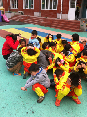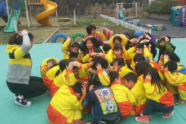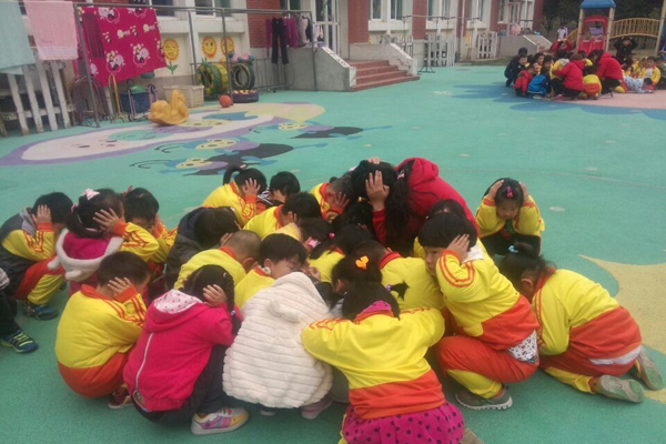 2014年3月24日下午14:40分左右,学校拉起了防空警报声,大一班幼儿在两位老师和两位阿姨的带领下进行了地震演习。要求幼儿双手抱头,快速并有序的跑至幼儿园操场空旷的安全地点立即蹲下。千万不能慌张、随意乱跑、不大声叫喊。班主任杨老师在前引路、配班赵老师断后,两位生活老师在队伍的中间,确保每位幼儿安全到达指定地点。