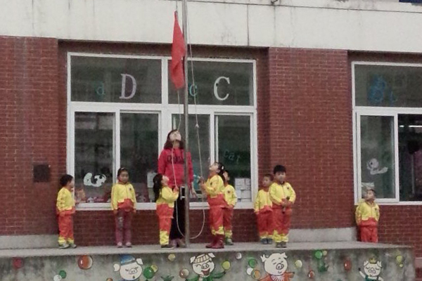 伴着进场的音乐声各班级已经陆续在场地上站好了。小一班的升旗手和护旗手也已准备完毕,当主持人宣布出旗时,四位护旗手就像四个小勇士一样小心的护送着国旗。鲜红的五星红旗徐徐上升,全体教师及幼儿庄严的目送着国旗并向国旗行注目礼。