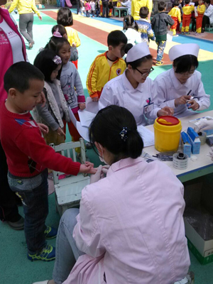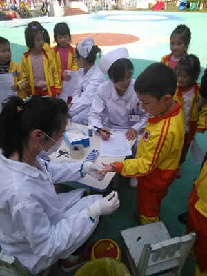 4月14日下午,莲花社区卫生服务站的医生就来到了我们世界外国语学校幼儿园,耐心、细致地为孩子们进行身高、体重、视力、口、鼻、胸腹部、血色素等方面的常规健康检查,检查过后,我们为每位幼儿建立体检档案,对幼儿的发育指标进行科学测评,医生们分工明确、态度温和,老师们也用鼓励、表扬的方式给予孩子们心理疏导,积极营造轻松的检查氛围,从而整个过程井然有序,很快完成了幼儿的体检任务。