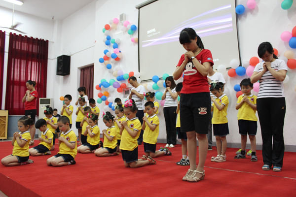 表演一直在进行,我们愉悦的心情也一直在持续。突然礼堂里的灯光开始消失,正当我们担心的时候,音乐却想起来了,原来是老师为孩子们精心准备的幻灯片开始播放,我们的脑海随着一张张笑脸开始飞扬: