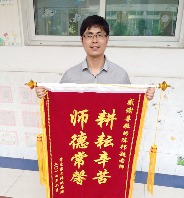 陈邦超老师是小学部一(5)班的班主任,对待工作严谨,对教学负责,对学生关爱是同事们对陈老师的一致评价。班主任工作无疑是辛苦与劳累的,而作为小学部外地班的班主任,面对这群一个月才能回家一次的学生们,陈老师的辛苦要比其他合肥班的班主任多一些。陈老师把更多的时间留给了孩子们,与孩子谈心,减轻他们想家的痛苦;陪孩子们学习,玩游戏,让孩子觉得学校和家一样温暖;每一个孩子的生日,陈老师都记得清清楚楚,并为他们定制美味可口的生日蛋糕,全班孩子一起陪着过生日。正是陈老师在生活中做的这一件件平常但却不平凡的小事让这个班集体温暖无比,让这个班集体的学生家长感受到了陈老师的默默耕耘,他们真切感受到他们的孩子是幸运的,遇到了这样一位负责、细心、心中装满爱的好老师。一面锦旗,八个大字,蕴含着学生家长对陈邦超老师工作的肯定,蕴含着学生家长对学校无言的满意。