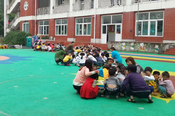2014年9月18日上午9点20,天空中飘着蒙蒙细雨 ,随着防空警报声响起,幼儿园里各班的老师都在同一时间带领孩子们有序地撤离教学楼,安全到达操场中央。每个班级的幼儿都双手抱头蹲在老师的身边。在全园教职员工的通力配合下,全园6个班、200多名师生在1分钟内就全部撤离出教学楼并到达操场中央的“安全地带”。