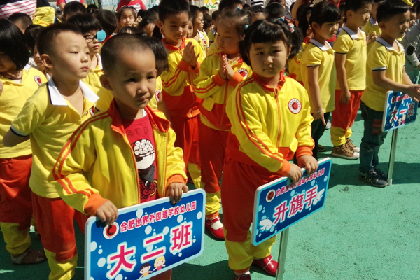 2014年9月22日九点三十分,合肥世界外国语学校幼儿园举行了第三周的升旗仪式。小朋友在老师们的带领下,伴随着升旗入场音乐,小朋友们整齐有序地列队在幼儿园的操场上。