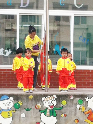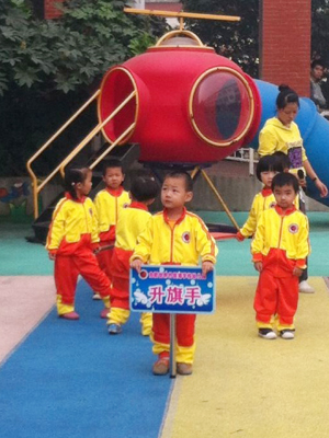 虽然小一班小朋友才刚入学一个多,但他们一个个带着灿烂的笑容,迈着整齐、有力的步伐走上升了旗台。鲜艳的五星红旗伴随着雄壮的国歌在旗台上冉冉升起。全场的老师们、小朋友们、伴随着乐曲唱起国歌,歌声嘹亮,悦耳动听。国旗迎风飘扬,昭示着合肥世界外国语学校幼儿园的孩子们在幸福的时代快乐健康成长。