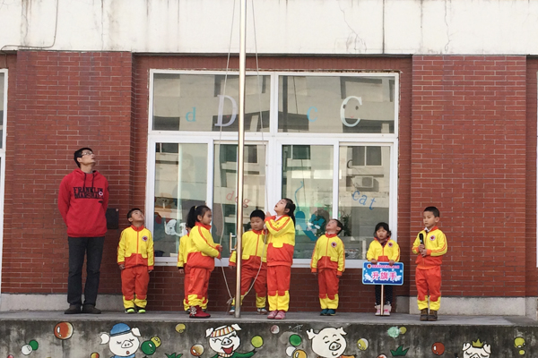 周一的早上阳光明媚,幼儿园操场上迎来了第九次升旗仪式,本周升旗仪式由中一班的小朋友承担。