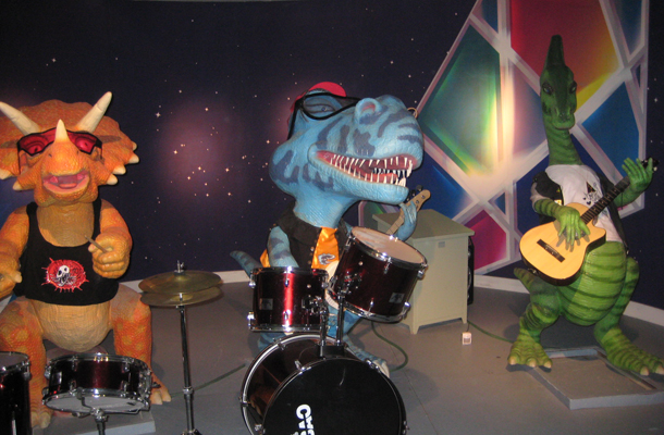 走进二楼,这里是恐龙的王国,这里的恐龙形态各异、种类繁多!剑龙、三角龙、霸王龙的模型赫然矗立在前,有种时空交错之感,仿佛置身于几亿年前的荒滩中。这么高大威武而霸气的恐龙突然消失,不禁令人心生感慨:物竞天择,适者生存,面对自然界亘古不变的法则,我们只有让自己变得更强,否则只有灭亡!角落里的一大群游客围着一支恐龙乐队,恐龙那可爱的造型和幽默的表情令人忍俊不禁!
