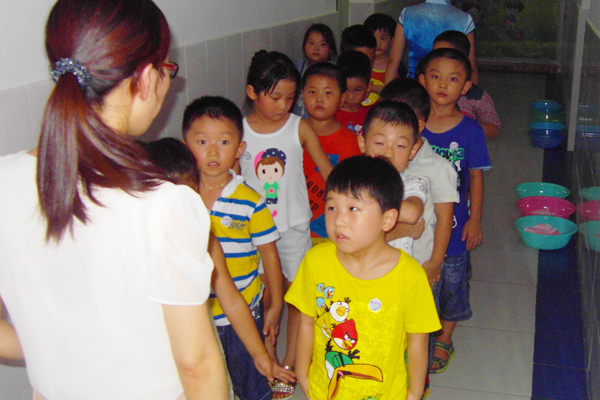 炎热天气,洗澡可算是快事一件了。之前老师已经给孩子们准备好了洗澡用品,所以孩子们拿好各自的洗澡盆来到了澡房门口,首先就是脱衣服,有的孩子的衣服是纽扣,一着急就解不开了,有的身上汗多,越急衣服越缠的紧,老师们都耐心的帮助他们,并告诉他们解决的方法,此时,我们的方主任已经将所有的水温亲自一一调试好,孩子们一个一个在老师的陪同下第一次离开爸爸妈妈独自洗澡。