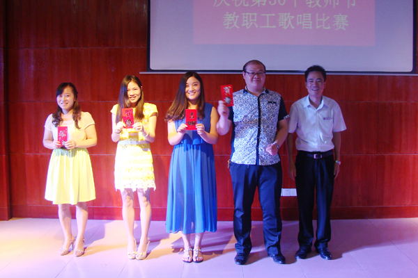 邵校长为歌唱比赛特等奖和集体奖的教职工颁奖