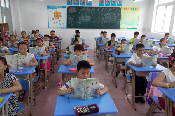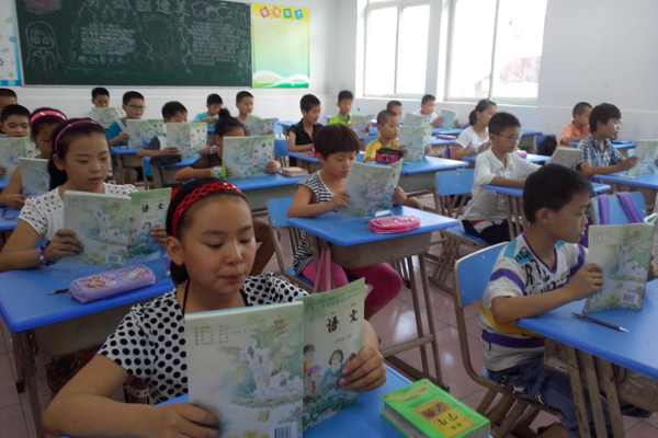 傍晚,晕黄的余晖透过窗棂投射进明亮规整的教室,小学部三十四个教室里已经坐得整整齐齐、满满当当,同学们手捧着新发到手、崭新的教科书,完全沉浸在知识的浩瀚海洋中,他们很快进入到课堂的气氛中,自发地朗读起课文。